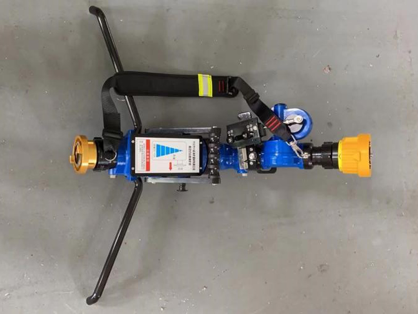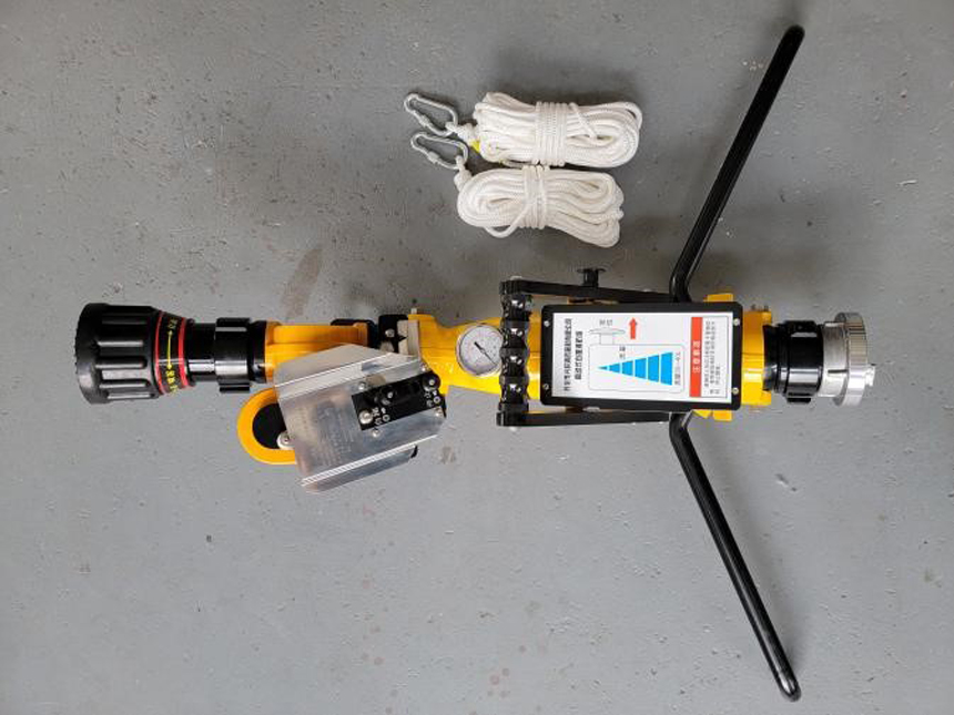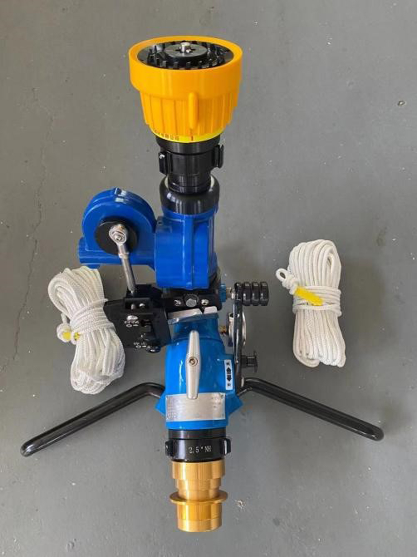 水力自擺移動水炮設計合理、結構緊湊、重心低、工作平穩等優點。水平回轉、炮頭俯仰螺桿傳動原理,自鎖性能好。既有流量可調、又有噴霧、直流功能。其操作簡單、靈活可靠、可折疊、便于攜帶與存放,在工作時,各部位都具有定位銷緊功能,以便消防人員定點噴射,撤離火場,是理想的移動式消防裝備器材。